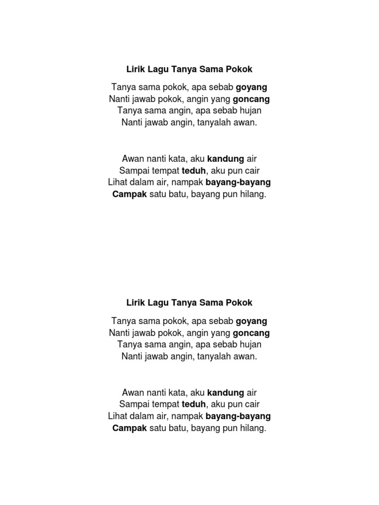 Nanti jawab langit Tanyalah awan Awan nanti kata Aku kandung air Sampai tempat sejuk Aku pun cair Tengok dalam air Nampak bayang-bayang Campak satu batu Bayang pun hilang. _ yakeshi said this on December 30 2009 at 1114 pm Reply. Lirik Lagu Tanya Sama Pokok - Lagu Kanak-Kanak.